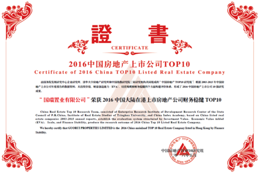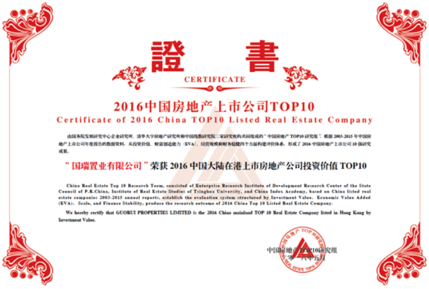 5月18日,2016中國房地產(chǎn)上市公司研究成果發(fā)布會在北京金融街威斯汀大酒店舉行。國瑞置業(yè)(2329.HK)一舉斬獲“2016大陸在港上市房地產(chǎn)公司投資價值TOP10”第五位、“2016大陸在港上市房地產(chǎn)公司財務(wù)穩(wěn)健TOP10”第七位。這是繼2014年上市后,國瑞置業(yè)連續(xù)兩年榮獲此項榮譽(yù),以企業(yè)綜合實力贏得行業(yè)內(nèi)外的認(rèn)可。 本次評選由國務(wù)院發(fā)展研究中心企業(yè)研究所、清華大學(xué)房地產(chǎn)研究所和中國指數(shù)研究所三家單位共同主辦,其研究成果已成為投資者評判上市公司綜合實力、發(fā)掘證券市場投資機(jī)會的重要標(biāo)準(zhǔn)。