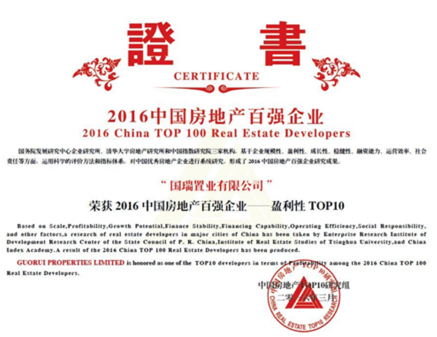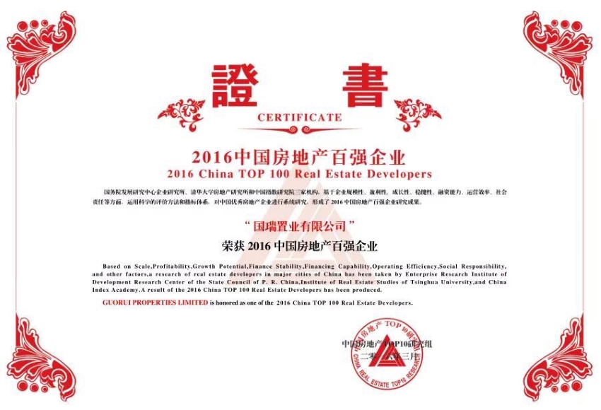 2016年3月24日上午,由國務院發(fā)展研究中心企業(yè)研究所、清華大學房地產(chǎn)研究所和中國指數(shù)研究院三家單位聯(lián)合舉辦的“2016中國房地產(chǎn)百強企業(yè)研究成果發(fā)布會”在北京釣魚臺國賓館舉行。國瑞置業(yè)有限公司榮獲2016年中國房地產(chǎn)百強企業(yè)榜單73名,同時斬獲“盈利性TOP10'和”融資能力TOP10“兩項殊榮。