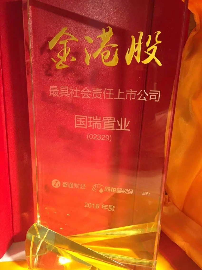 2017年1月13日,深港通新機遇高峰論壇暨2016“金港股”評選頒獎典禮在深圳隆重舉行,港股上市公司國瑞置業(yè)(2329.HK)一舉奪得“最具社會責(zé)任上市公司”獎項。